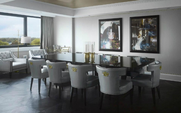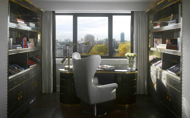 Το κίτρινο, το αγαπημένο χρώμα της βασίλισσας Ελισάβετ, «φωτίζει» μια παλέτα από πλατίνα και κρεμ αποχρώσεις που κυριαρχούν στο χώρο. Το σχήμα της χαρακτηριστικής μικρή τσάντα της, υπάρχει σε πολλά σημεία, όπως στα πόμολα στις πόρτες.