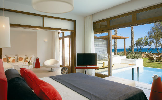Ο χώρος της κρεβατοκάμαρας με την τεράστια τζαμαρία απέναντι από το προσκέφαλο προσφέρει απίστευτη θέα της θάλασσας, που απλώνεται μπροστά από το resort.