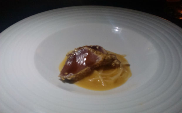 Θα γευτείτε, μεταξύ άλλων, φιλέτο σκουμπρί με πιπεριές, τσίλι, κόλιανδρο και λάιμ yusu, εξαιρετική μοασχαρίσια taliata ουρουγουάης black angus, απίστευτα ζουμερή κόντρα γάλακτος Γαλλίας, ενώ η έκπληξη της βραδιάς ήταν η χοιρινή πανσέτα σιγοψημένη για 24 ώρες στους 63 βαθμούς, συνοδεία σπιτικού πουρέ.
