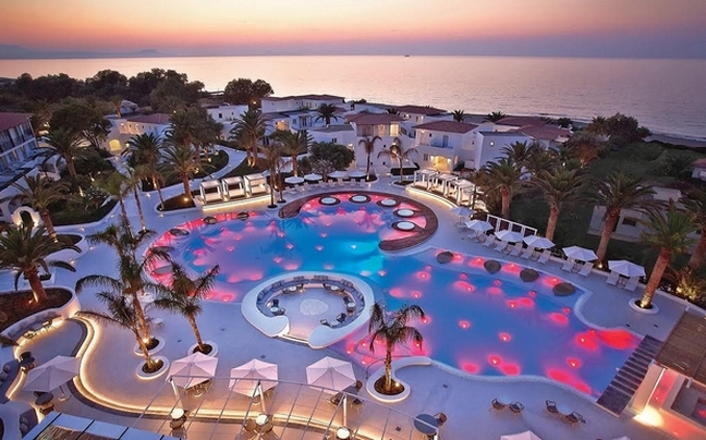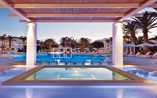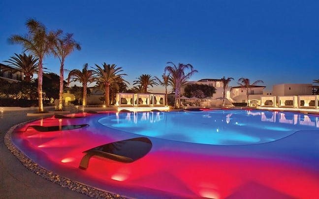 Η ονειρική πισίνα εντυπωσιάζει με καθηλωτικό φωτισμό και χρώματα που εναλλάσσονται, υπέροχα ξύλινα deck και σαλόνια ηλιοθεραπείας με ιδιαίτερα εξωτικά έπιπλα σε σχήμα φύλλων και ιδιωτικά Gazebo με ολοήμερο service.
