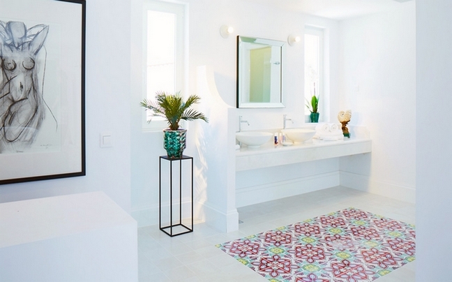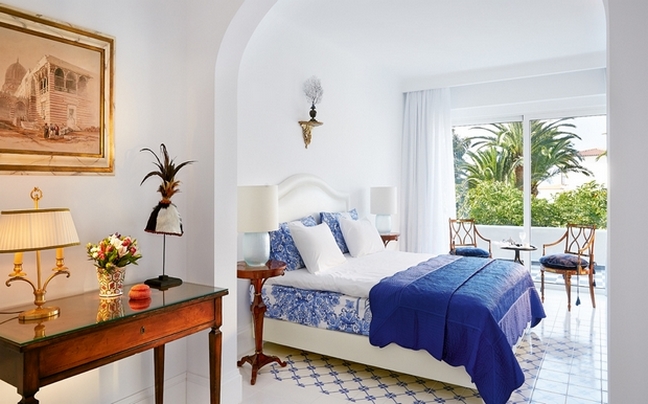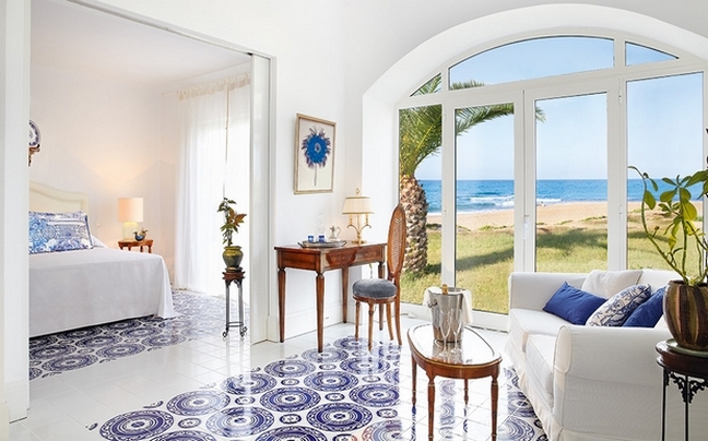 Θα εντυπωσιαστείτε με τα χειροποίητα πλακάκια που ντύνουν τα πατώματα των δωματίων, τα ακριβά έπιπλα με μαρκετερί και υφάσματα επώνυμων σχεδιαστών σε αποχρώσεις του λευκού και της θάλασσας.