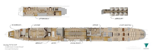 Το μήκος του αεροσκάφους φτάνει τα 200 μέτρα, ενώ το πλάτος του τα έξι μέτρα, με αποτέλεσμα να υπάρχει αρκετός χώρος για τη δημιουργία ενός εστιατορίου, μιας τραπεζαρίας, μιας master κρεβατοκάμαρας και υπνοδωματίων επισκεπτών, καθώς επίσης και δύο μεγάλα καθιστικά και χώρο γραφείου, με αίθουσα συνεδριάσεων.