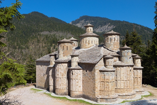 Ο ναός καλύπτεται με στέγη από πλάκες σχιστόλιθου πάνω από την οποία υψώνονται 12 τρούλοι και τρουλίσκοι κτιστοί.