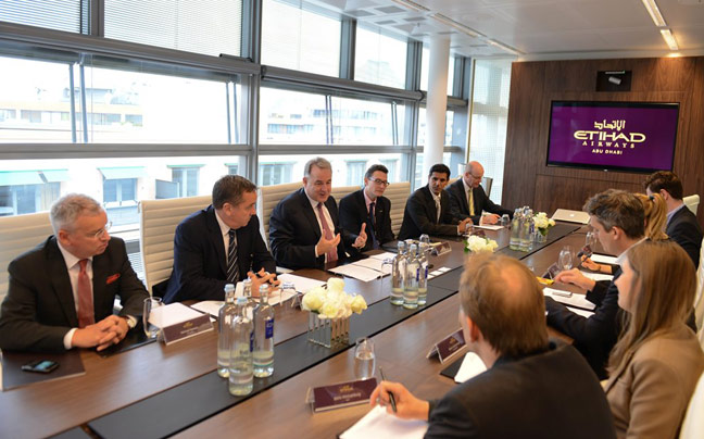 Ο Πρόεδρος και Γενικός Διευθυντής της Etihad Airways, James Hogan, υποδέχεται εκπροσώπους των Μέσων Μαζικής Ενημέρωσης στα νέα κεντρικά γραφεία της αεροπορικής για Γερμανία και Ευρώπη.