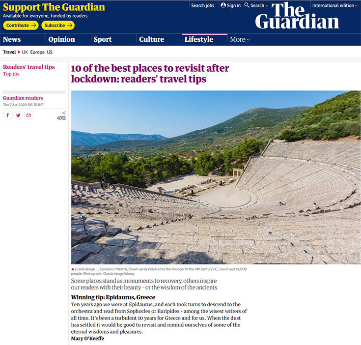Οι Βρετανοί είναι γνωστό τοις πάσι ότι αγαπάνε ιδιαίτερως τη χώρα μας. Αυτή τη φορά ο Guardian, μετά την Telegraph που την προηγούμενη εβδομάδα ανέδειξε την Ελλάδα ως τον κορυφαίο προορισμό για μετά την κρίση του κορονοϊού, κάλεσε τους αναγνώστες του να αναδείξουν τα τοπ 10 μέρη για ταξίδια μετά τη λήξη της κρίσης που έχει προκαλέσει παγκοσμίως η πανδημία του κορονοϊού.