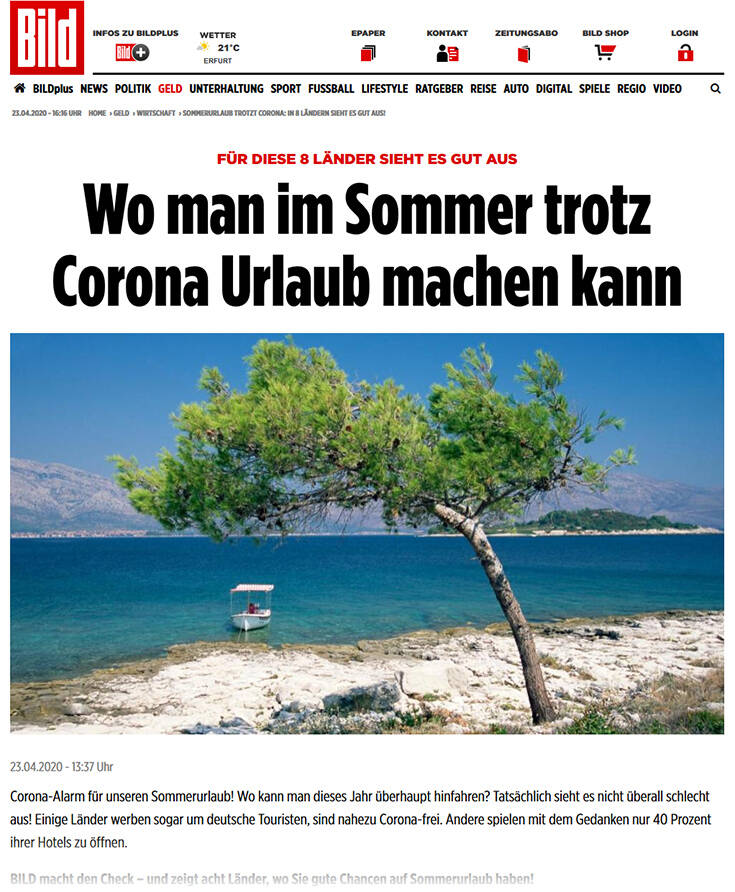 Στο ερώτημα «που μπορεί να πάει κανείς αυτή τη χρονιά για διακοπές;» η γερμανική εφημερίδα επισημαίνει ότι στην πραγματικότητα τα πράγματα δεν είναι παντού τόσο άσχημα. Κάνοντας αναφορά στην Ελλάδα τονίζει ότι ορισμένες χώρες, οι οποίες διεκδικούν Γερμανούς τουρίστες, είναι σχεδόν ακίνδυνες από τον κορονοϊό.