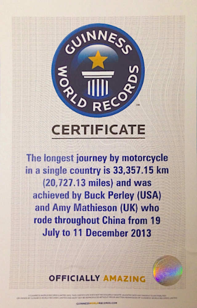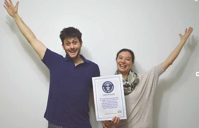 Λογικά λοιπόν δεν επέλεξαν να ταξιδέψουν στην Ανδόρρα, το Μονακό ή την Ελλάδα. Όχι, το περιπετειώδες ζευγάρι αποφάσισε να κατακτήσει το σχετικό ρεκόρ του Βιβλίου Γκίνες ταξιδεύοντας με τη μοτοσυκλέτα τους μέσα στην Κίνα.