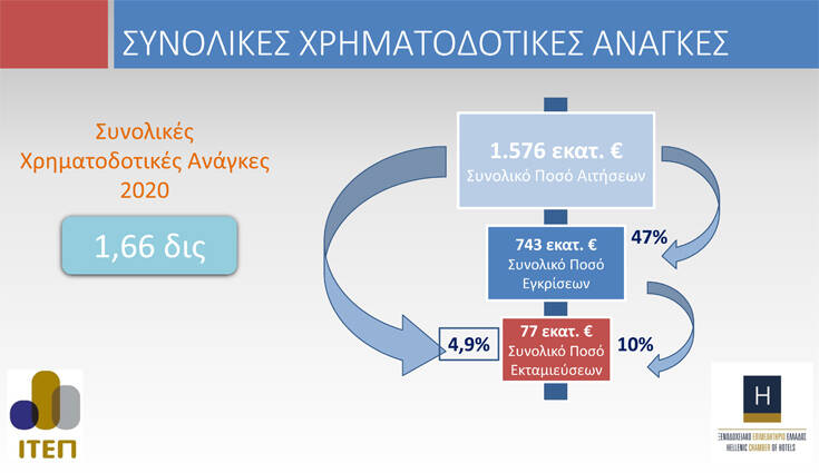 Τέλος, σε αυτό το εξαιρετικά δύσκολο περιβάλλον, οι χρηματοδοτικές ανάγκες των ξενοδοχείων διαμορφώνονται στα 1,66 δις ευρώ. Έχουν υποβληθεί αιτήσεις σε προγράμματα και χρηματοδοτικά εργαλεία συνολικού ύψους 1,576 δις ευρώ, με τις εγκρίσεις να ανέρχονται στα 743 εκ. ευρώ. Από το ποσό αυτό εκτιμάται ότι έχουν εκταμιευτεί μέχρι 10 Ιουλίου 2020 μόλις 77 εκ. ευρώ.