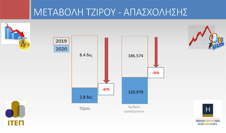 Επίσης, οι ξενοδόχοι ανοίγουν τις επιχειρήσεις τους με πλήρη συναίσθηση των δυσκολιών που αντιμετωπίζουν. Συγκεκριμένα, διαβλέπουν πτώση του τζίρου κατά μ.ο. 67% (από τα 8,4 δις ευρώ το 2019 στα 2,8 δις ευρώ το 2020, συνολική απώλεια 5,6 δις) και κάμψη της απασχόλησης κατά 35% (από 186.574 εργαζόμενους το 2019 στους 120.979 εργαζόμενους το 2020).