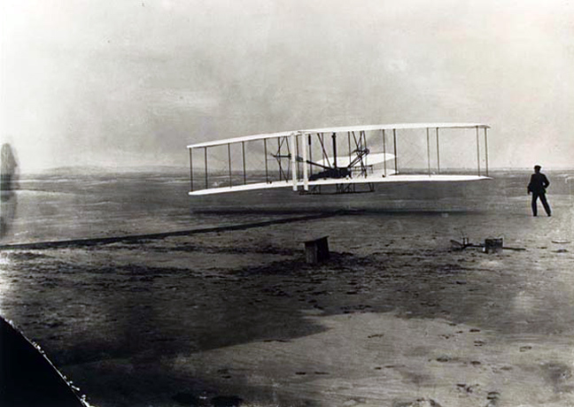 Στις 17 Δεκεμβρίου του 1903 οι αδερφοί Ράιτ κατάφεραν να προσγειώσουν με ασφάλεια, μετά από μια πτήση μερικών δευτερολέπτων, το πρώτο μηχανικά προωθούμενο αεροπλάνο.