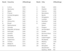 Δίχως αξιόλογες μεταβολές, συγκριτικά με τους ανάλογους πίνακες του παρελθόντος, η κορυφαία 20άδα των δημοφιλέστερων χωρών και πόλεων για φιλοξενία συνεδρίων το 2013 του ICCA παρουσιάζει την ακόλουθη εικόνα: