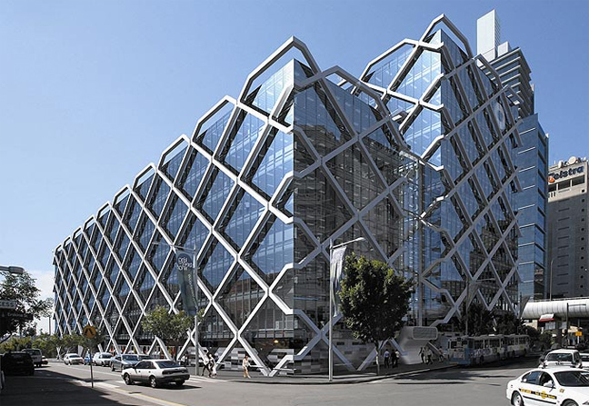 Ένα από τα πιο εντυπωσιακά στοιχεία του κτιρίου της αυστραλιανής τράπεζας Macquarie Bank είναι το λευκό πλέγμα που «τυλίγει» τη γυάλινη κατασκευή.