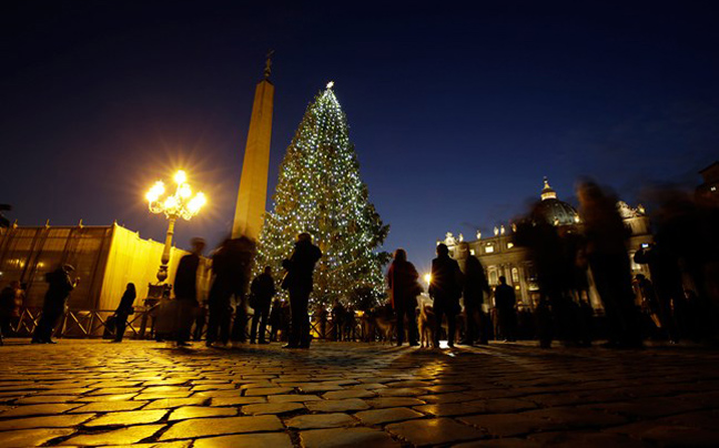 Οι επισκέπτες της πλατείας του Αγίου Πέτρου στη Ρώμη συρρέουν για να δουν το χριστουγεννιάτικο δέντρο του Βατικανού. Το 25 μέτρων δέντρο είναι δώρο από ένα γερμανικό χωριό στη Βαυαρία.