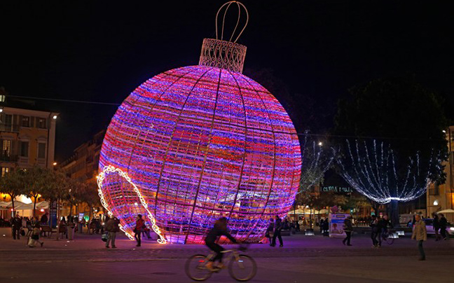 Αυτή η γιγαντιαία χριστουγεννιάτικη μπάλα είναι μόνο ένα από μια σειρά μεγάλων στολιδιών, που διακοσμούν εορταστικά την γαλλική πόλη της Νίκαιας.