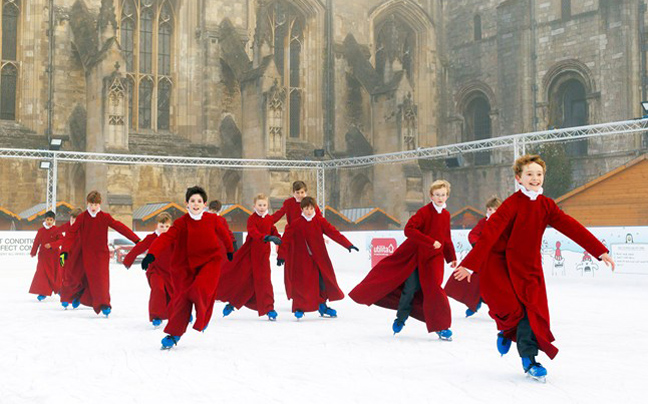 Τα αγόρια της χορωδίας του καθεδρικού ναού του Winchester στην Αγγλία, απολαμβάνουν ένα πρωινό πατινάζ στο παγοδρόμιο της εκκλησίας, που θα παραμείνει ανοιχτό έως τις 5 Ιανουαρίου.