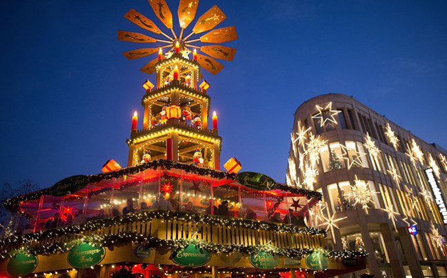 Μια χριστουγεννιάτικη πυραμίδα δεσπόζει πάνω από ένα παραδοσιακό κατάστημα στο Ανόβερο της Γερμανίας.
