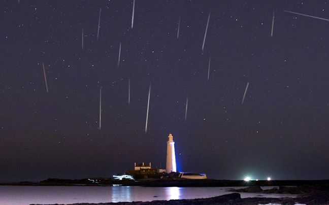 Μια θεαματική βροχή μετεωριτών διακρίνεται στον ξάστερο ουρανό του Whitley Bay, στην Αγγλία, πάνω από τον φάρο της Αγίας Μαρίας.