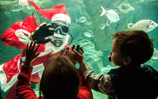 Ένας δύτης, ντυμένος Άγιος Βασίλης, χαιρετά χαρούμενα παιδάκια σε ενυδρείο στην Κρήτη.