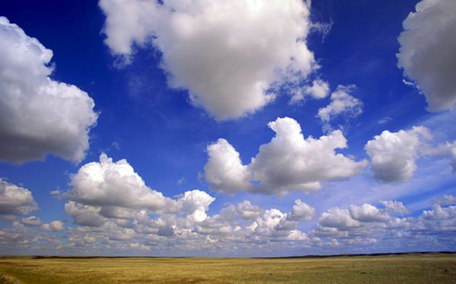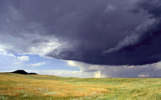 Πυκνά σύννεφα γεμίζουν τον ουρανό πάνω από ένα λιβάδι στο Saskatchewan του Καναδά.