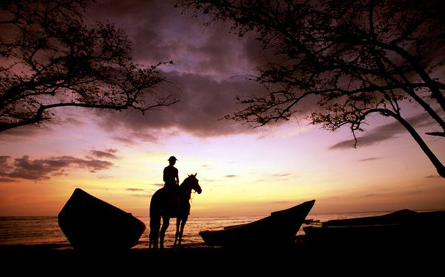Η μοναδική εικόνα ενός καβαλάρη, πάνω στο άλογο του σκιαγραφείται από τη θάλασσα και τον ουρανό σε μια παραλία της Κόστα Ρίκα.