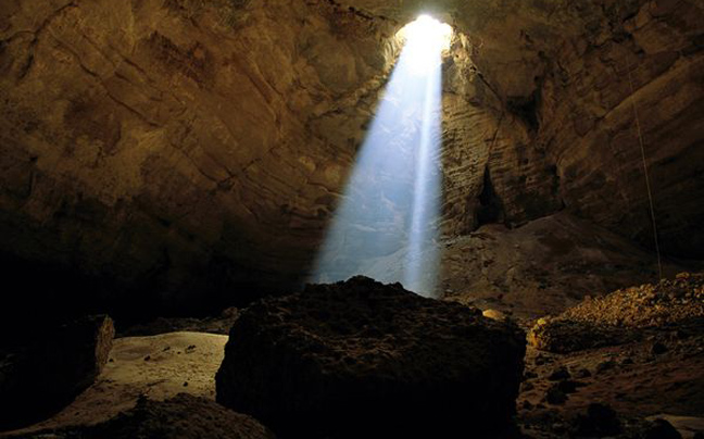 Το φως του ήλιου δημιουργεί μια υπέροχη δέσμη στο σπήλαιο Majlis Al Jinn, μπαίνοντας από ένα άνοιγμα στον βράχο.