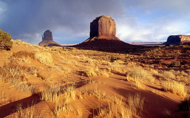 Το χρυσό φως του ήλιου πέφτει πάνω στο Merrick Butte στην Αριζόνα.