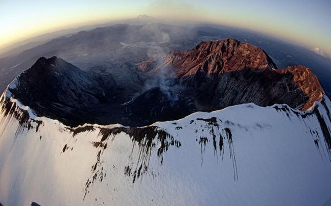 Εναέρια άποψη του όρους της Αγίας Ελένης, όπου το χιόνι έχει στολίσει τον φυσικό κώνο, που δημιουργήθηκε μετά από την ηφαιστειακή έκρηξη.