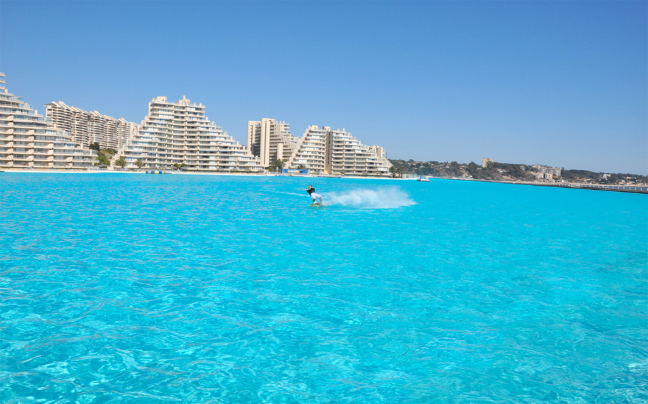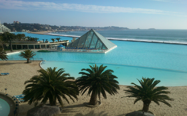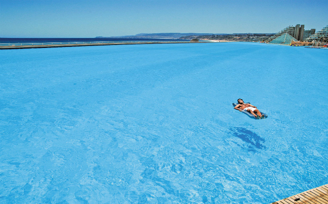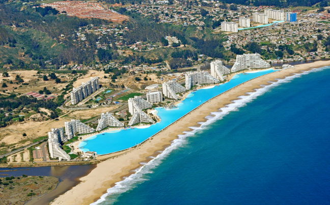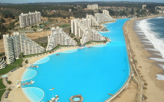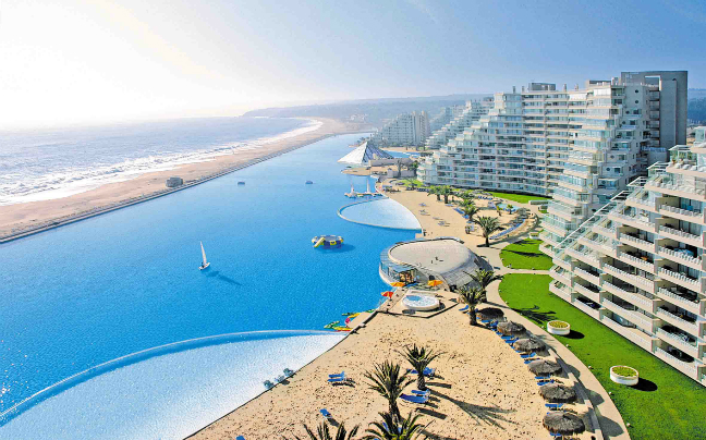 Η τεράστια πισίνα του ξενοδοχείου San Alfonso del Mar στην Χιλή, δεσπόζει κατά μήκος της ακτογραμμής της και έχει μέγεθος μεγαλύτερο από 20 πισίνες ολυμπιακών διαστάσεων.
