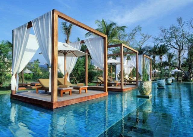 Πλαισιωμένη με φοίνικες και με θέα τα γαλαζοπράσινα νερά της θάλασσας Ανταμάν, η πισίνα του ξενοδοχείου Sarojin εντυπωσιάζει με τα ανοιχτά δωμάτια-«νησάκια» με αναπαυτικές ξαπλώστρες και αφαιρούμενη οροφή.