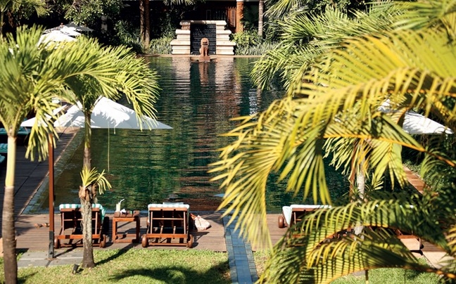 Η πισίνα στο ξενοδοχείο Belmond La Résidence d’Angkor στο Siem Reap πλαισιώνεται από την καταπράσινη ζούγκλα και εντυπωσιακούς ναούς. Αν το κοντινό Angkor Wat είχε πισίνα θα ήταν κάπως έτσι.