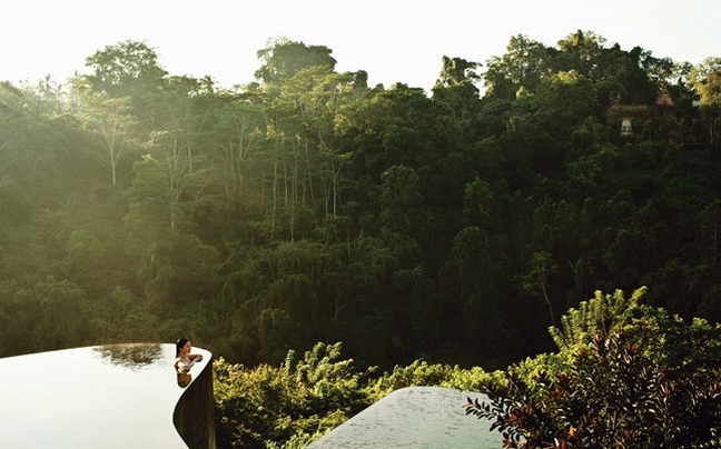 Η κλιμακωτή πισίνα υπερχείλισης στο ξενοδοχείο Ubud Hanging Gardens στο Μπαλί, βρίσκεται στην κορυφή ενός λόφου και περιβάλλεται από τροπικό δάσος. Κάθε δωμάτιο στο ξενοδοχείο έχει τη δική του πισίνα υπερχείλισης με παρόμοια καταπράσινη θέα.