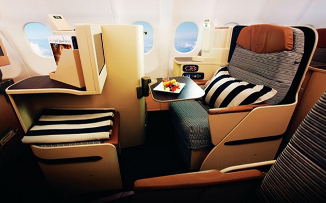 Οι επιβάτες της έχουν ιδιωτική τηλεόραση και αριστοκρατικά δερμάτινα καθίσματα, που μετατρέπονται σε κρεβάτι, με ενσωματωμένο μασάζ . Όλες οι κατηγορίες διαθέτουν το εν πλω σύστημα ψυχαγωγίας της Emirates, που προσφέρει έως και 1.500 κανάλια.