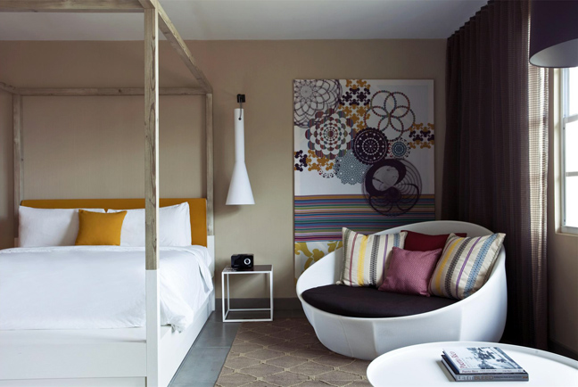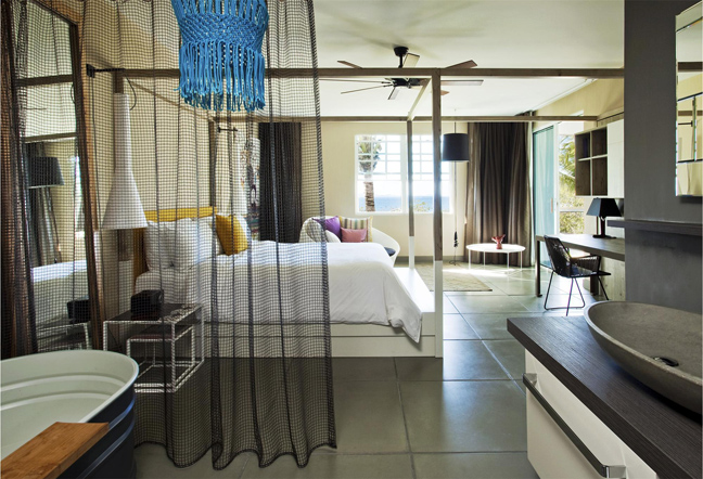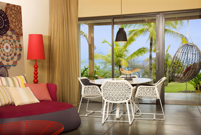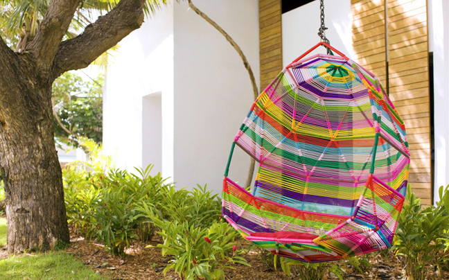 Έντονες χρωματικές πινελιές στα υφάσματα, τα μαξιλάρια και τα διακοσμητικά αντικείμενα δίνουν έναν νεανικό αέρα στους χώρους, στους οποίους δεσπόζουν τα παιχνιδιάρικα έπιπλα, όπως οι πολύχρωμες συρμάτινες πολυθρόνες, τα διπλά κρεβάτια και οι μπανιέρες από χάλυβα.
