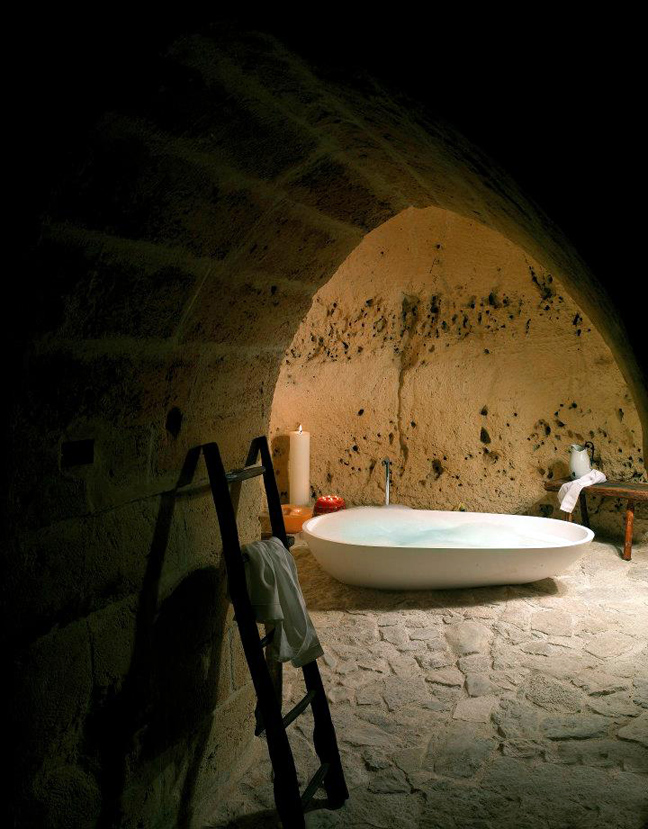 Τα μπάνια είναι σύγχρονα και καμπυλόγραμμα. Οι αυτόνομες μπανιέρες σε σχήμα αγγείου στέκονται δίπλα από στοίβες κεριών δίπλα σε πλούσια, ξύλινη επίπλωση. Φως διαρρέει μέσα από μικρές προεξοχές στους πέτρινους τοίχους και τις ξύλινες οροφές.