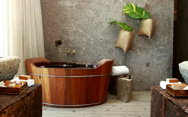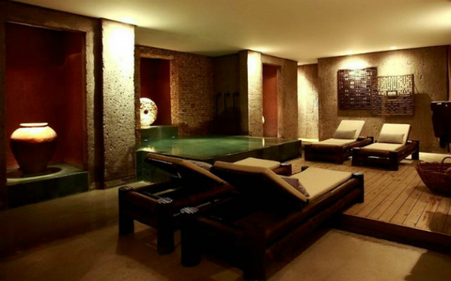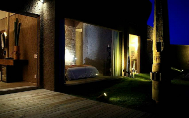To γυαλισμένο ξύλο έρχεται σε αντίθεση με γυμνούς τοίχους από τούβλα, πρωτογενή υλικά δένουν αρμονικά με σύγχρονες πινελιές και μια μοντέρνου σχεδιασμού ορθογώνια πισίνα έρχεται σε πλήρη αντίθεση με έναν φωτισμένο πέτρινο τοίχο.Όλα αυτά συμπληρώνονται με θηλυκά αξεσουάρ, όπως στρογγυλεμένα δοχεία και αχυρένιες ομπρέλες.