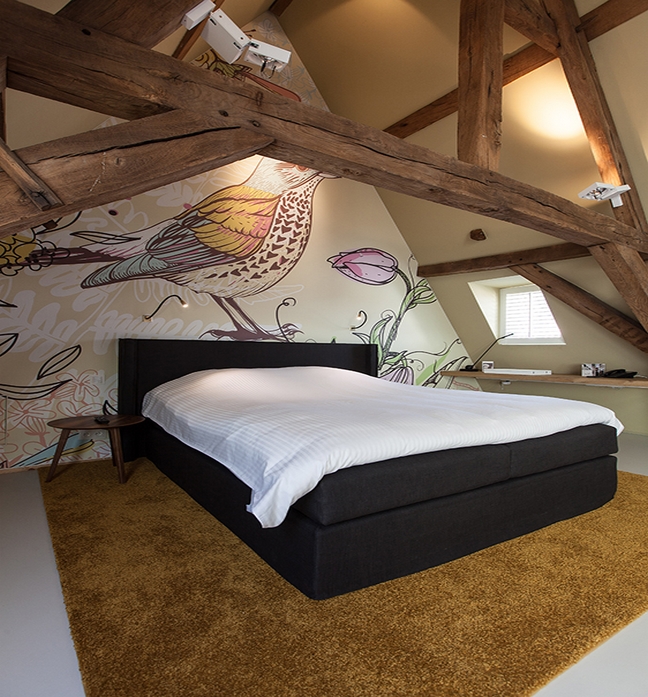 Παλιά ξύλινα δοκάρια στην οροφή τονίζουν την λιτή και σύγχρονη διακόσμηση, ενώ τα εντυπωσιακά κρεβάτια “Nilson” διαθέτουν κλινοσκεπάσματα από εκλεπτυσμένο βελγικό λινό, δίνοντας μια αίσθηση πολυτέλειας.