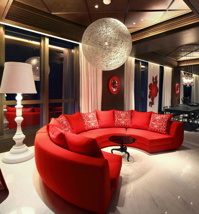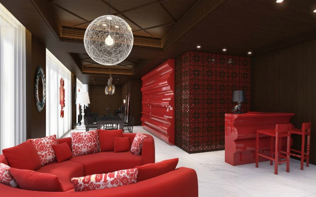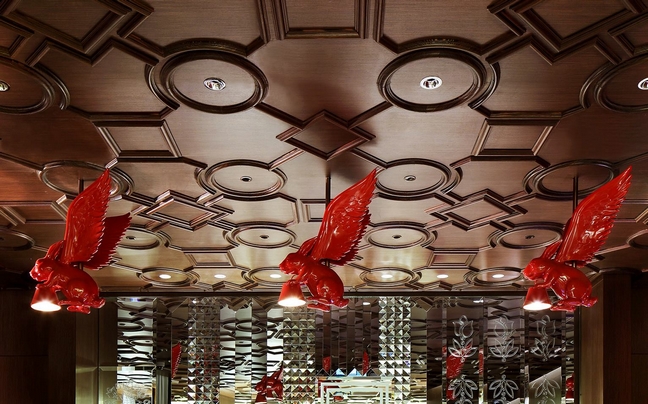 Προβολείς ενσωματωμένοι στα καφασωτά ξύλινα ταβάνια παρέχουν πρόσθετη φωτεινότητα, όπως και τα κυματιστά λευκά ράφια στους τοίχους, Ανατολίτικα χαλιά, πήλινα αγγεία και κόκκινα floral στόρια παραπέμπουν για άλλη μια φορά σε κινέζικους μύθους.