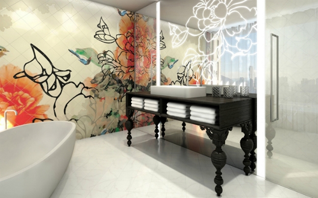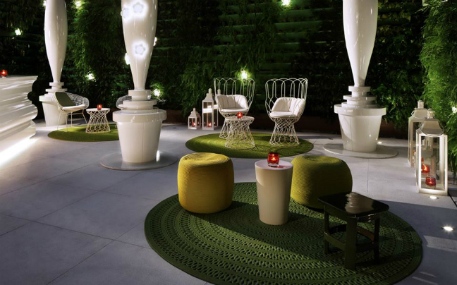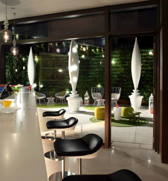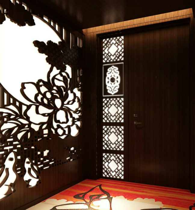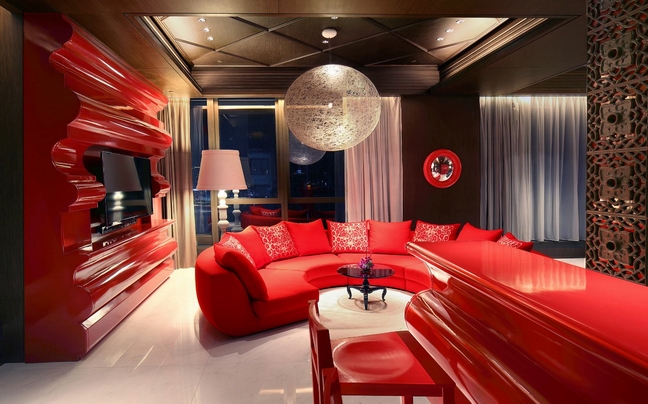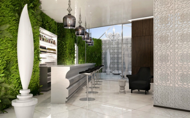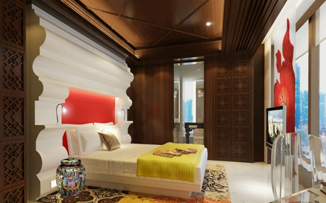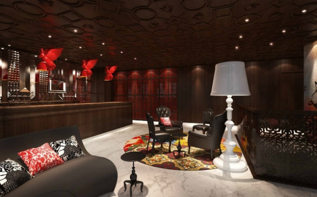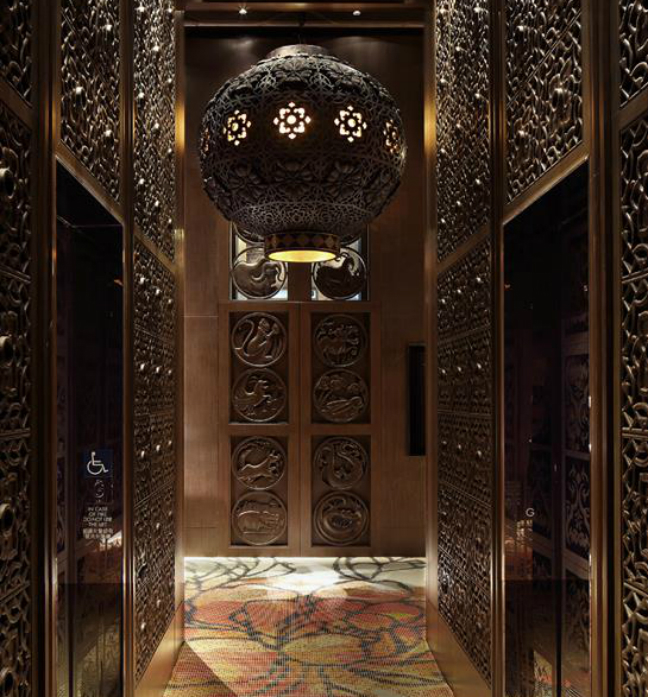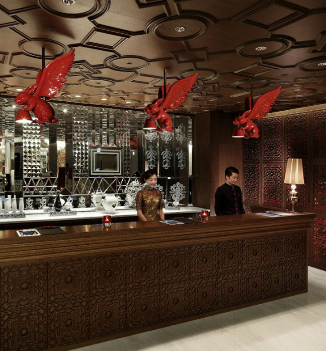 Το μπαρ πλαισιώνεται από λευκά γλυπτά, στο σχήμα της φλόγας, ενώ ένας ολόκληρος τοίχος είναι καλυμμένος από πλούσιο πράσινο φύλλωμα . Αλλού, η παραδοσιακή κινεζική χειροτεχνία αναδεικνύεται μέσα από πιο έντονα στοιχεία, όπως η σκαλιστή επένδυση ξύλου και τα πορτοκαλί και κίτρινα χαλιά.