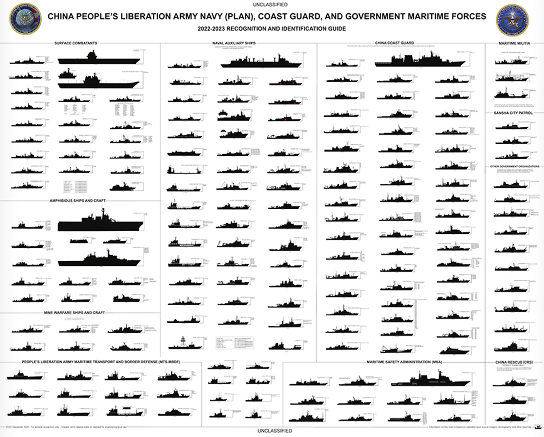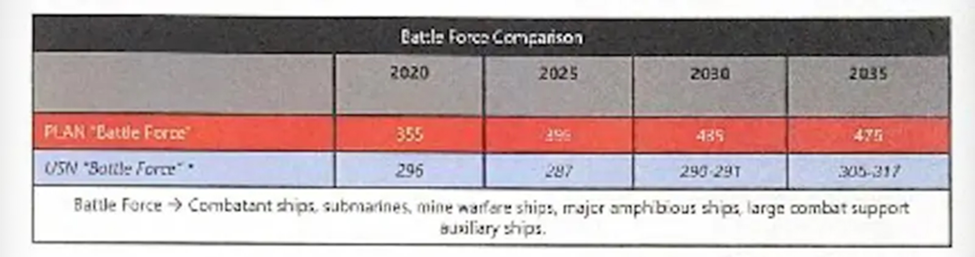 Σύμφωνα με τα στοιχεία των ΗΠΑ, για το 2021 ,η Κίνα διέθετε περισσότερα από 355 πλοία, αντίθετα ο στόλος των ΗΠΑ ανερχόταν σε 296 πλοία, σύμφωνα με έκθεση του Κέντρου Στρατηγικών και Διεθνών Μελετών. Μάλιστα η διαφορά μεταξύ των δύο χωρών φαίνεται πως θα συνεχίσει να αυξάνεται. Βάσει της ετήσιας έκθεση του Πενταγώνου για το 2022 σχετικά με τη στρατιωτική ανάπτυξη της Κίνας προβλέπεται πως ο κινεζικός στόλος θα αυξηθεί περαιτέρω σε 400 πλοία έως το 2025 και σε 440 πλοία έως το 2030.