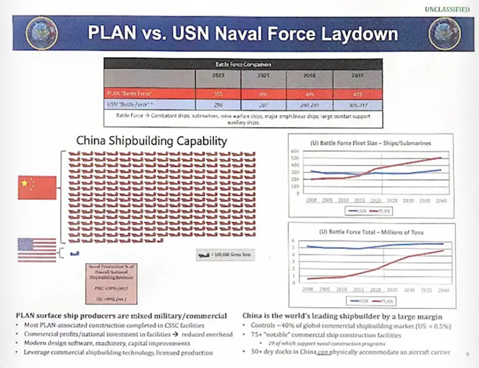Την μεγάλη ενίσχυση της Κίνας, στο επίπεδο του στρατιωτικού ανταγωνισμού, επιβεβαιώνει ένα νέο έγγραφο – διαφάνεια του πολεμικού ναυτικού των ΗΠΑ σχετικά με τη ναυπηγική ικανότητα του ασιατικού γίγαντα. Το έγγραφο με τίτλο «PLAN vs. USN Naval Force Laydown» δείχνει πως τα ναυπηγεία της Κίνας έχουν πάνω από 200 φορές μεγαλύτερη παραγωγή από αυτά των ΗΠΑ. Συγκεκριμένα η δυναμική τους ανέρχεται σε 23,2 εκατομμύρια τόνους, ενώ των ΗΠΑ κινείται σε περίπου 100.000 τόνους.