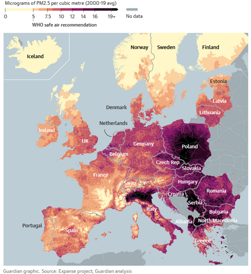 Βάσει των στοιχείων, η χώρα με τον πιο μολυσμένο αέρα στην Ευρώπη είναι η Βόρεια Μακεδονία, ενώ, σε γενικό επίπεδο, η Ανατολική Ευρώπη βρίσκεται σε πολύ χειρότερη κατάσταση από τη Δυτική, εξαιρουμένης της Ιταλίας. Στην Ελλάδα, σύμφωνα πάντα με την έρευνα του Guardian, τα επίπεδα των αιωρούμενα σωματίδια κινούνται από 7,5 έως και 14 μg/m3 ανά περιοχή.