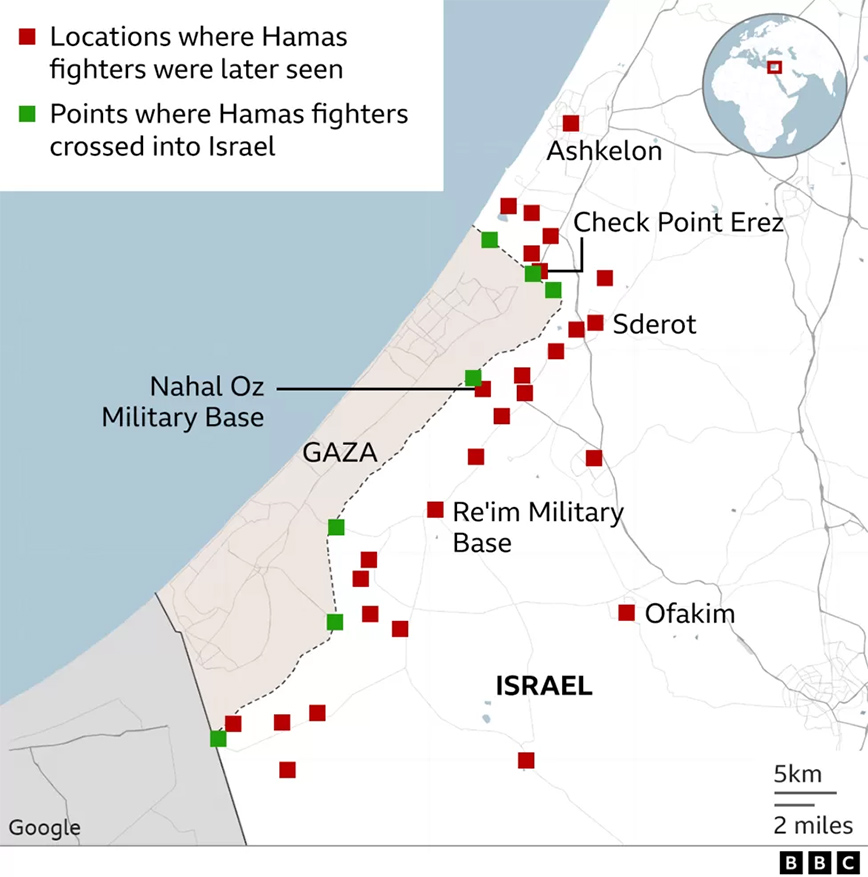 Ο παρακάτω χάρτης δείχνει τα σημεία απ’ όπου εισήλθαν στο έδαφος του Ισραήλ καθώς και τις περιοχές στις οποίες κατάφεραν να φτάσουν.