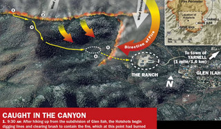Στο σχεδιάγραμμα φαίνεται το σημείο (2) που βρισκόντουσαν ασφαλείς οι πυροσβέστες, την έναρξη (1) της πορείας τους μέσα στη χαράδρα με τη φωτιά να είναι πίσω τους, τον δρόμο (4) που ακολούθησαν, το πύρινο μέτωπο που ξαφνικά βρέθηκε μπροστά τους (5), το σημείο που ήθελαν να φτάσουν (the ranch) και εκεί (6) που τελικά εγκλωβίστηκαν.