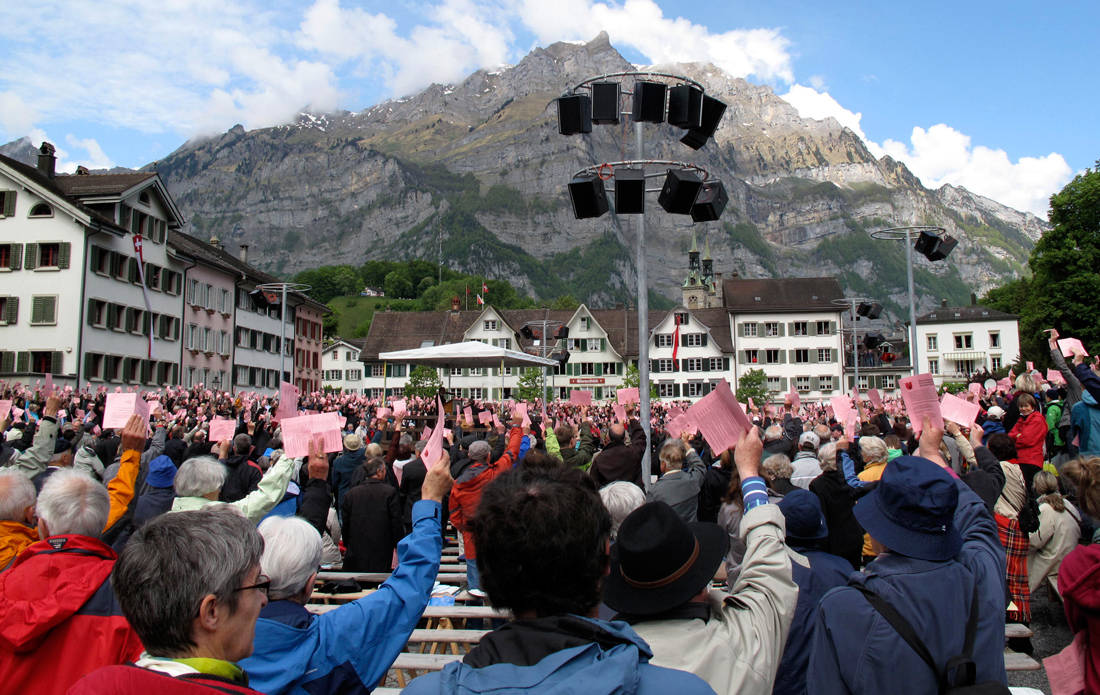 Ταυτοχρόνως, υπάρχουν και δυο καντόνια (Απενζέλ Ινερχόντεν και Γκλάρους) όπου η λαϊκή συνέλευση (Landsgemeinde) συνεχίζει να εκλέγει τους αντιπροσώπους της δι’ ανατάσεως της χειρός! Μερικές χιλιάδες πολίτες συρρέουν για να αποφασίσουν για το παρόν και το μέλλον τους και χωρίς τη μυστικότητα μάλιστα του παραβάν. Το παμπάλαιο αυτό σύστημα αμεσοδημοκρατικής ψηφοφορίας έχει και τα υπέρ και τα κατά του, όσο το θέλει όμως ο λαός δεν πέφτει σε κανέναν λόγος. Αν σταματήσει εξάλλου να το θέλει, θα το αλλάξει. Με την ίδια ανάταση του χεριού…