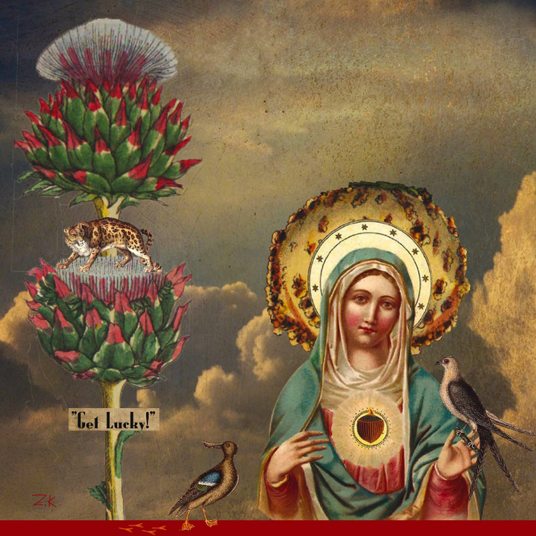 Όταν φτιάχνω τα χειροποίητα κολάζ μου χρησιμοποιώ παλαιότερες καρτ ποστάλ, περιοδικά, εφημερίδες, γκραβούρες. Με βοηθάει πολύ σε αυτό το κατάστημα που έχουμε το οποίο διαθέτει πολύ υλικό από διάφορα μέρη του κόσμου. Στη συνέχεια τα ψηφιοποιώ και τα επεξεργάζομαι ηλεκτρονικά.