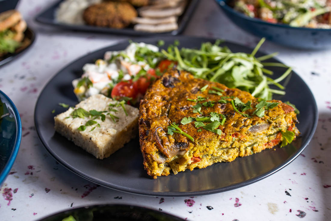 Έχει ως βάση ηλιόσπορους και σπόρους chia. Επίσης η συνταγή περιέχει μανιτάρια, πιπεριές, ντομάτα και μυρωδικά. Συνοδεύεται με «τυρί» από κάσιους και σπιτική vegan ρώσικη σαλάτα.
