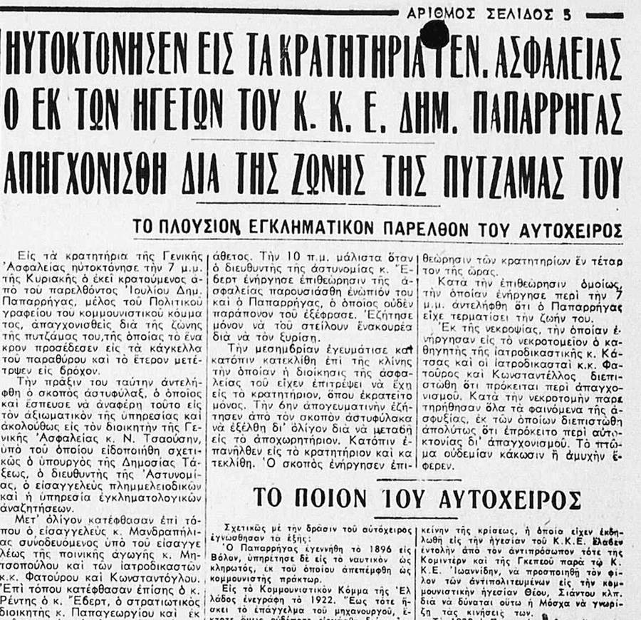 Αιτιολογώντας την «αυτοκτονία» ο συντάκτης αναφέρει πως «φαίνεται ότι δεν είχε το σθένος να αντιμετωπίση τας συντριπτικάς κατηγορίας, με τας οποίας εβαρύνετο, ούτε όμως ήθελε και να αρνηθή ταύτας ενώπιον του Στρατοδικείου, φοβούμενος την μήνιν των αυθεντών του. Λέγεται ακόμη, ότι μεταξύ αυτού και του Β. Μαρκεζίνη αντηλλάγησαν βαρύταται εκφράσεις, καθ΄όσον προς στιγμήν, ο Παπαρρήγας υποψιάσθη ότι επρόδωσε το κρησφύγετόν του ο Μαρκεζίνης. Εις μίαν μάλιστα στιγμιαίαν προ καιρού συνάντησίν των, εις τα κρατηρήρια της Γενικής Ασφαλείας, ο Μαρκεζίνης ηκούσθη λέγων αποτεινόμενος προς τον Παπαρρήγα: Βρε άτιμε, εγώ δεν είμαι προδότης…».