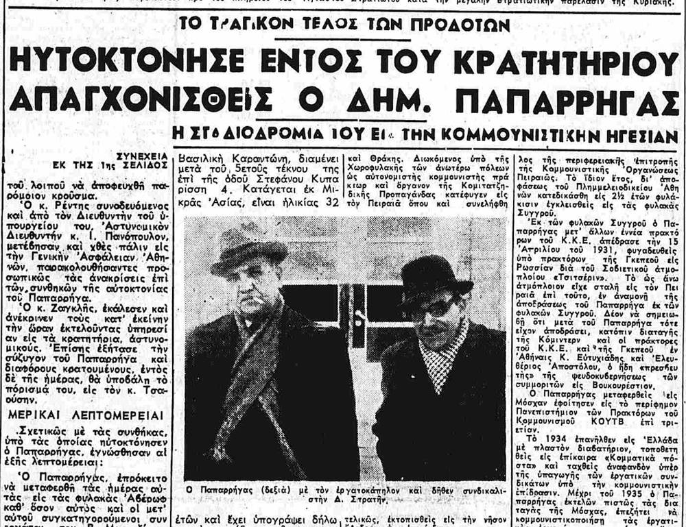 Χαρακτηριστικό δημοσίευμα της εφημεριδας Εθνικός Κήρυξ για τον θάνατο του Παπαρήγα