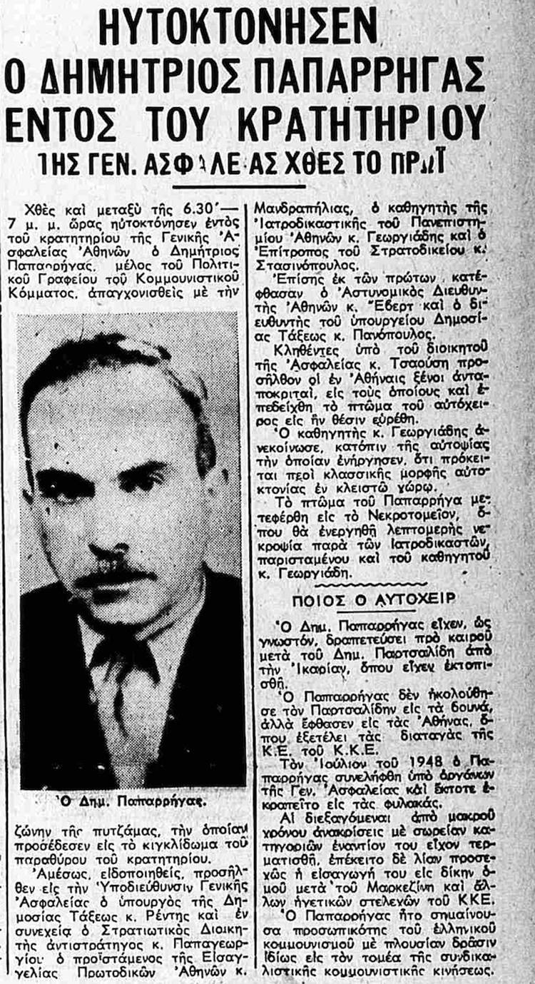 «Πρόκειται για τον Δημήτριο Παπαρήγα, μέλος του Πολιτικού Γραφείου του Κομμουνιστικού Κόμματος. Εκρατείτο εδώ και οκτώ μήνες. Απαγχονίστηκε στις 18:30 με 19:00 σήμερα το απόγευμα στα κρατητήρια με το κορδόνι της πιτζάμας του, που το είχε προσδέσει στο κιγκλίδωμα του κελιού. Ακόμη και η νεκροψία, όπως μπορεί να σας επιβεβαιώσει και ο καθηγητής κ. Γεωργιάδης, δείχνει ότι πρόκειται περί κλασικής μορφής αυτοκτονίας εν κλειστό χώρο. Σημείωμα ή επιστολή δεν βρέθηκε» τους εξηγεί, σε μια προσπάθεια να καταρρίψει οποιαδήποτε άλλη εκδοχή μπορεί να ακουγόταν.