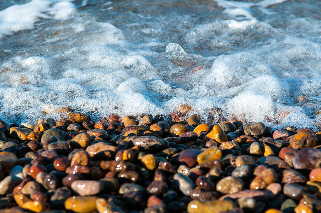 Αν καταφέρεις και αποτραβήξεις το βλέμμα σου από τα βότσαλα, θα παρατηρήσεις πως εξίσου πολύχρωμοι είναι και οι βράχοι με τους παιχνιδιάρικους σχηματισμούς στα δεξιά της ακτής. Κρυστάλλινα νερά και αρμυρίκια για φυσική σκιά ολοκληρώνουν το καθηλωτικό σκηνικό.